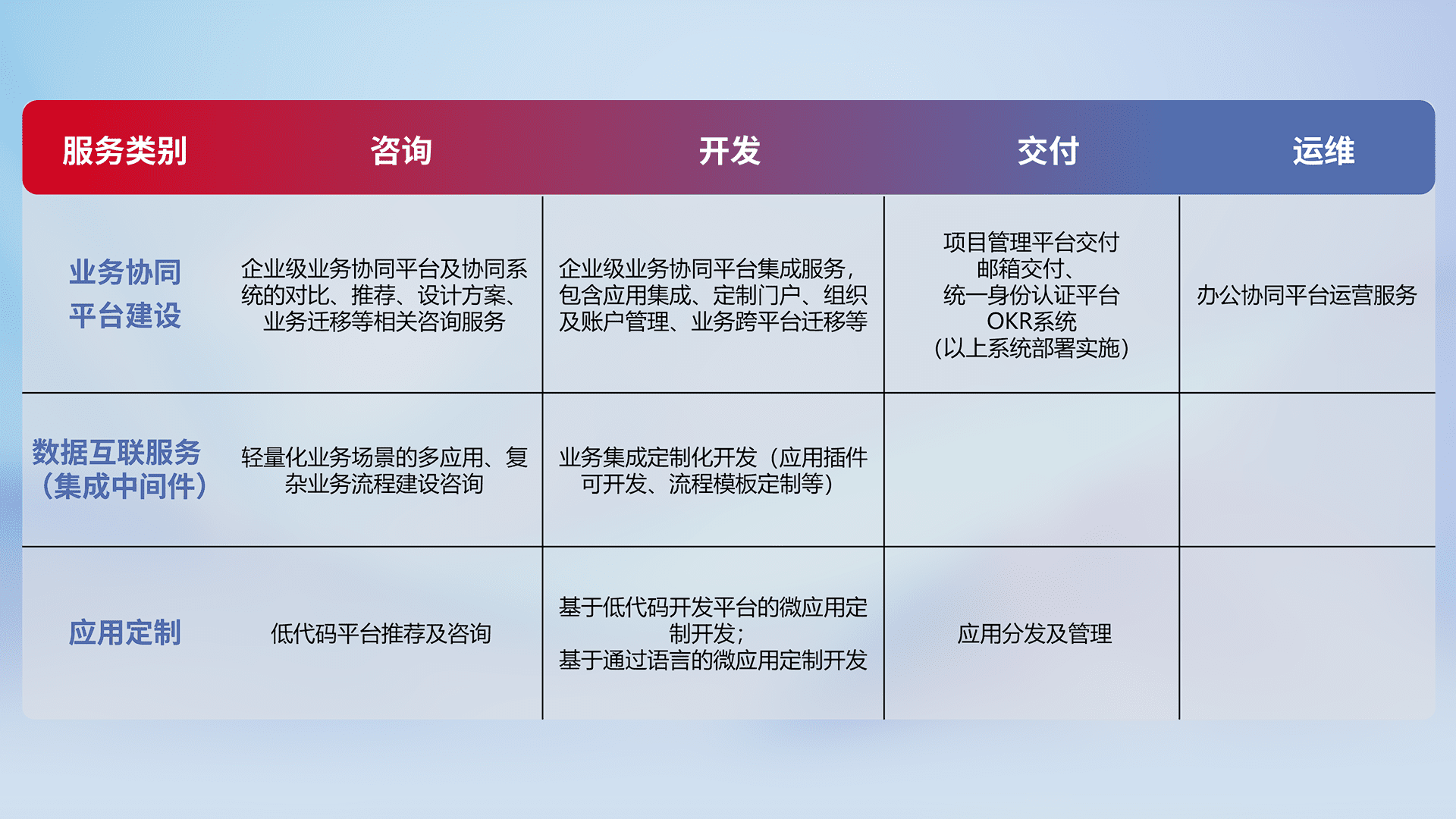 针对钉钉、、企微、、、IDaas等平台级产品提供产品的规划、、、方案、、交付、、、定制化开发等服务,,,实现如统一协同办公、、、、智能客户服务、、、、混合会议管理、、、智能数据查询、、、等业务场景,,实现数字化转型。。。