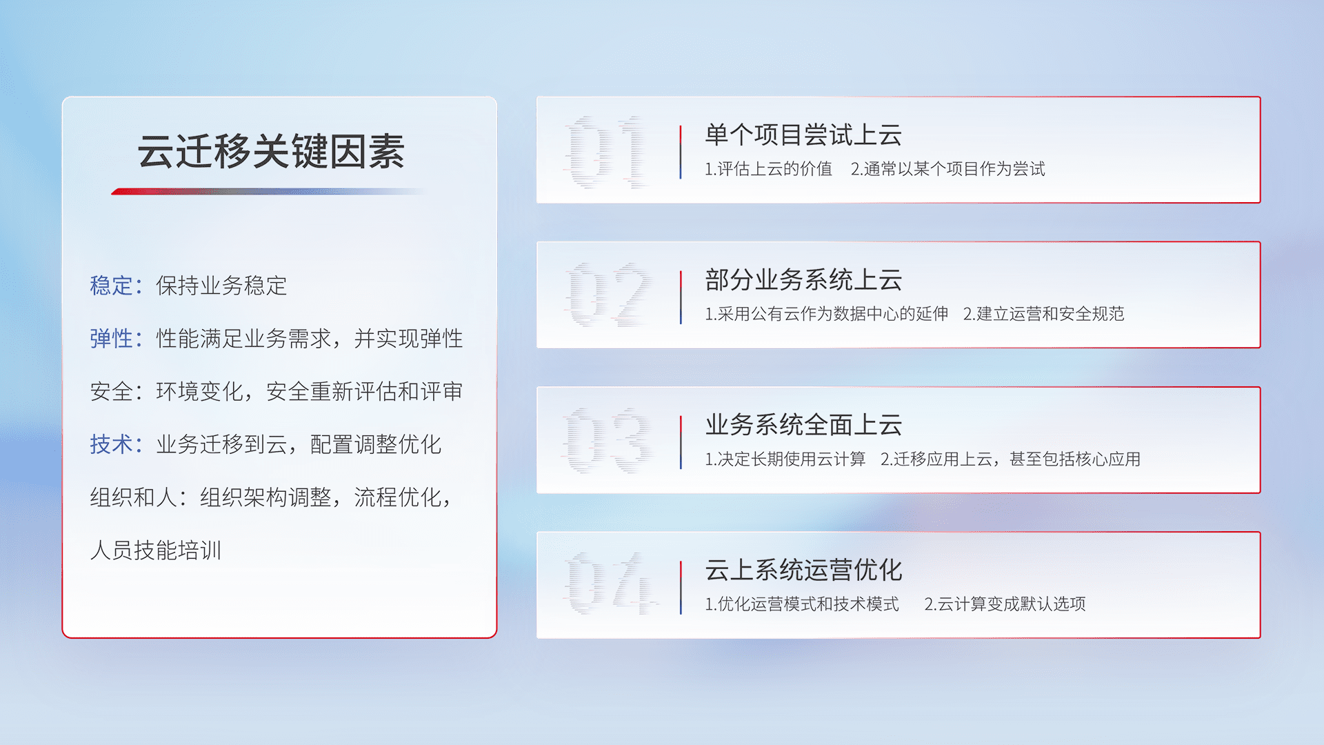结合实际业务,,,,从规划设计、、、云平台选型、、、云原生改造、、数据迁移、、、集成交付,,迁移全过程为客户识别最佳上云路径,,,做好风险识别管理,,设计网络架构、、身份权限、、安全审计合规、、、、操作审计、、、、日志审计、、监控告警策略、、多站点容灾设计等,,对云上基础设施进行整体规划,,,提升IT治理水平,,,以满足弹性、、高可用、、、高性能的需求。。。