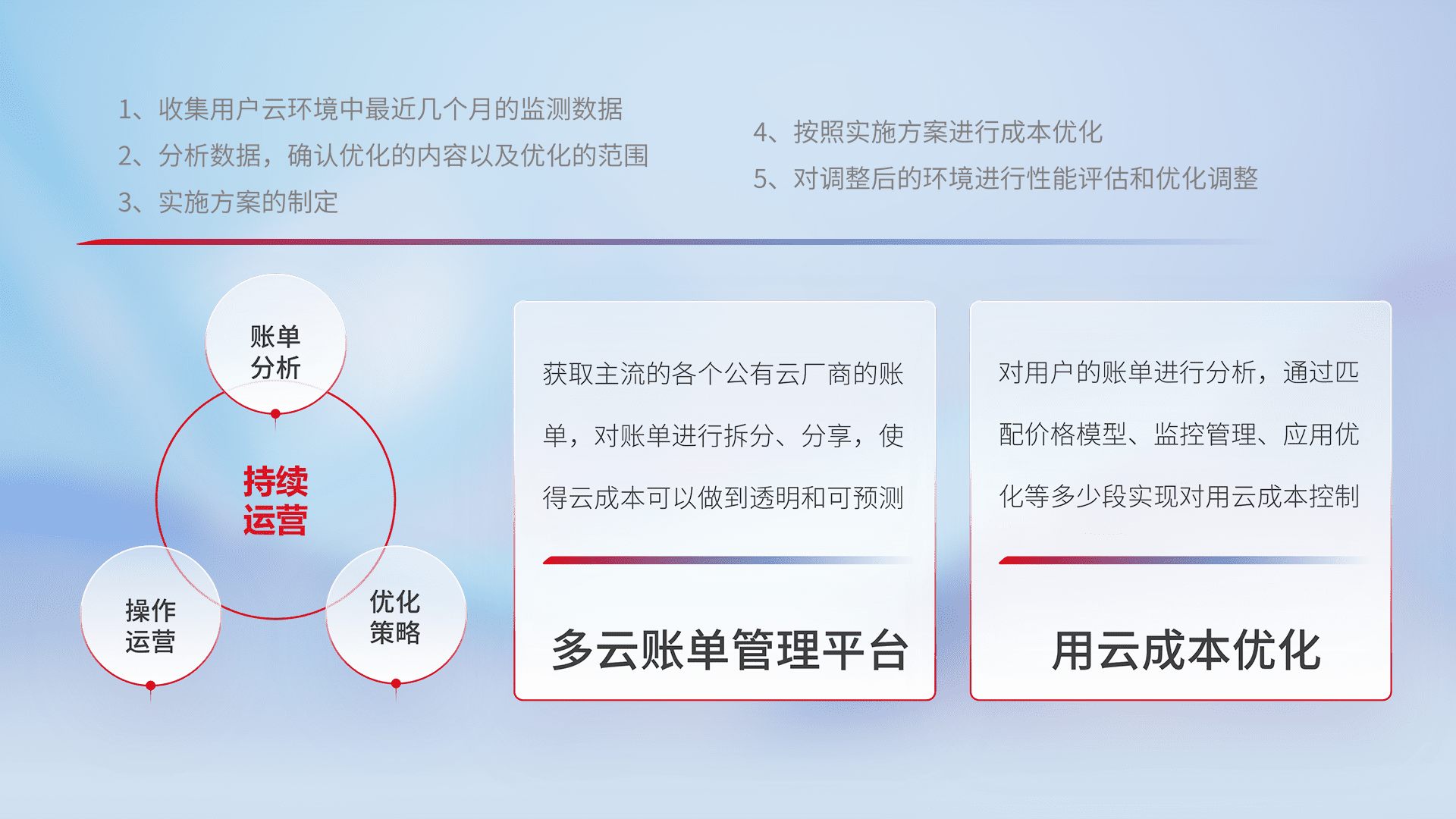 通过多云纳管,,,以统一的资源数据模型把客户的云资源进行抽象和封装,,,,进而实现对多云资源的统一操作,,,,保障云资源管理的可靠性、、、稳定性与可用性。。。量身定制化运维内容,,,配置、、、、开发运维、、、补丁管理、、、、备份、、、监控、、、认证和访问管理、、审计和日常巡检等,,,,保障在用云过程中的可靠度,,,,稳定度以及高可用率。。。